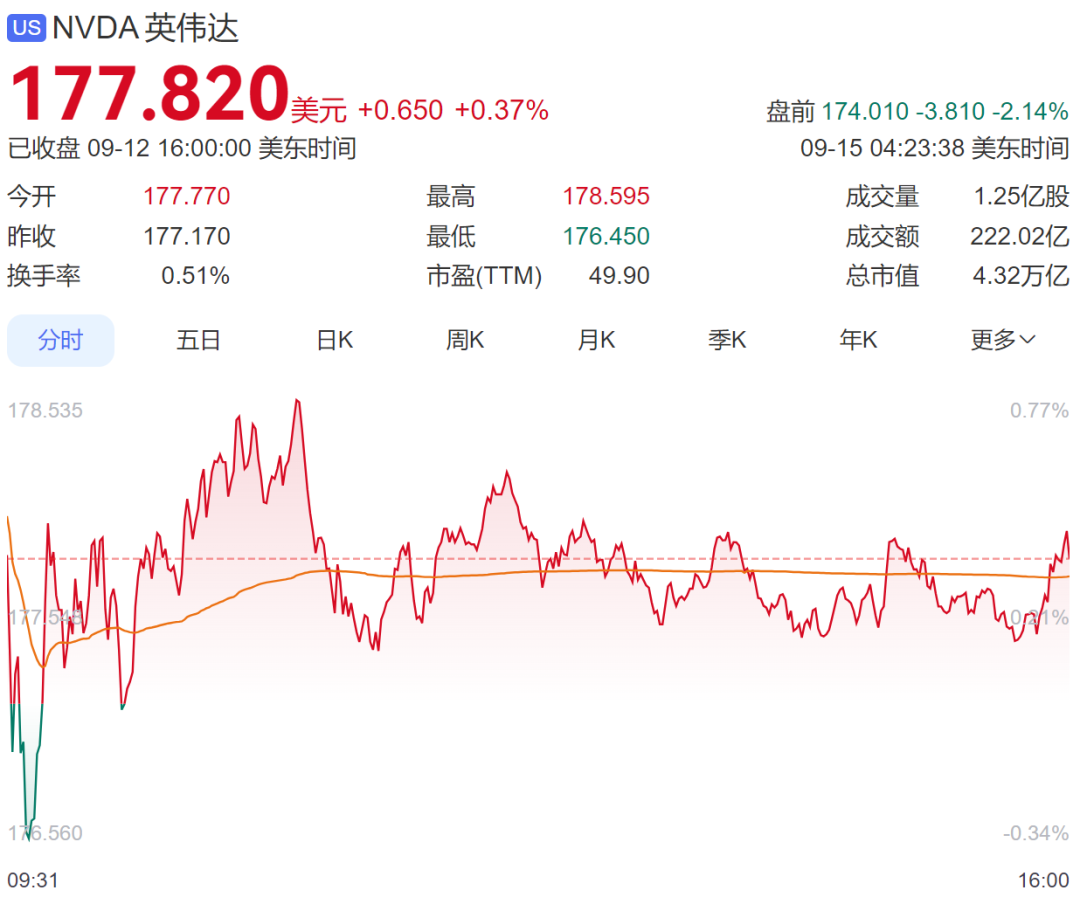 北京时间9月15日,英伟达美股盘前直线下挫。截至9月15日17:20,英伟达盘前下跌超2%。