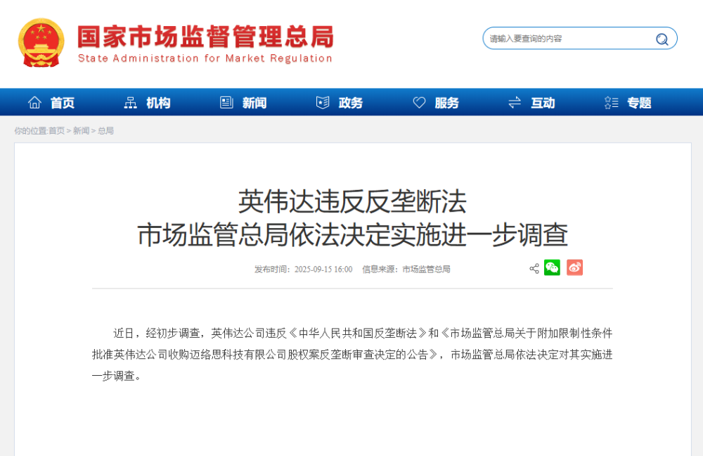 据国家市场监管总局消息,近日,经初步调查,英伟达公司违反《中华人民共和国反垄断法》和《市场监管总局关于附加限制性条件批准英伟达公司收购迈络思科技有限公司股权案反垄断审查决定的公告》,市场监管总局依法决定对其实施进一步调查。